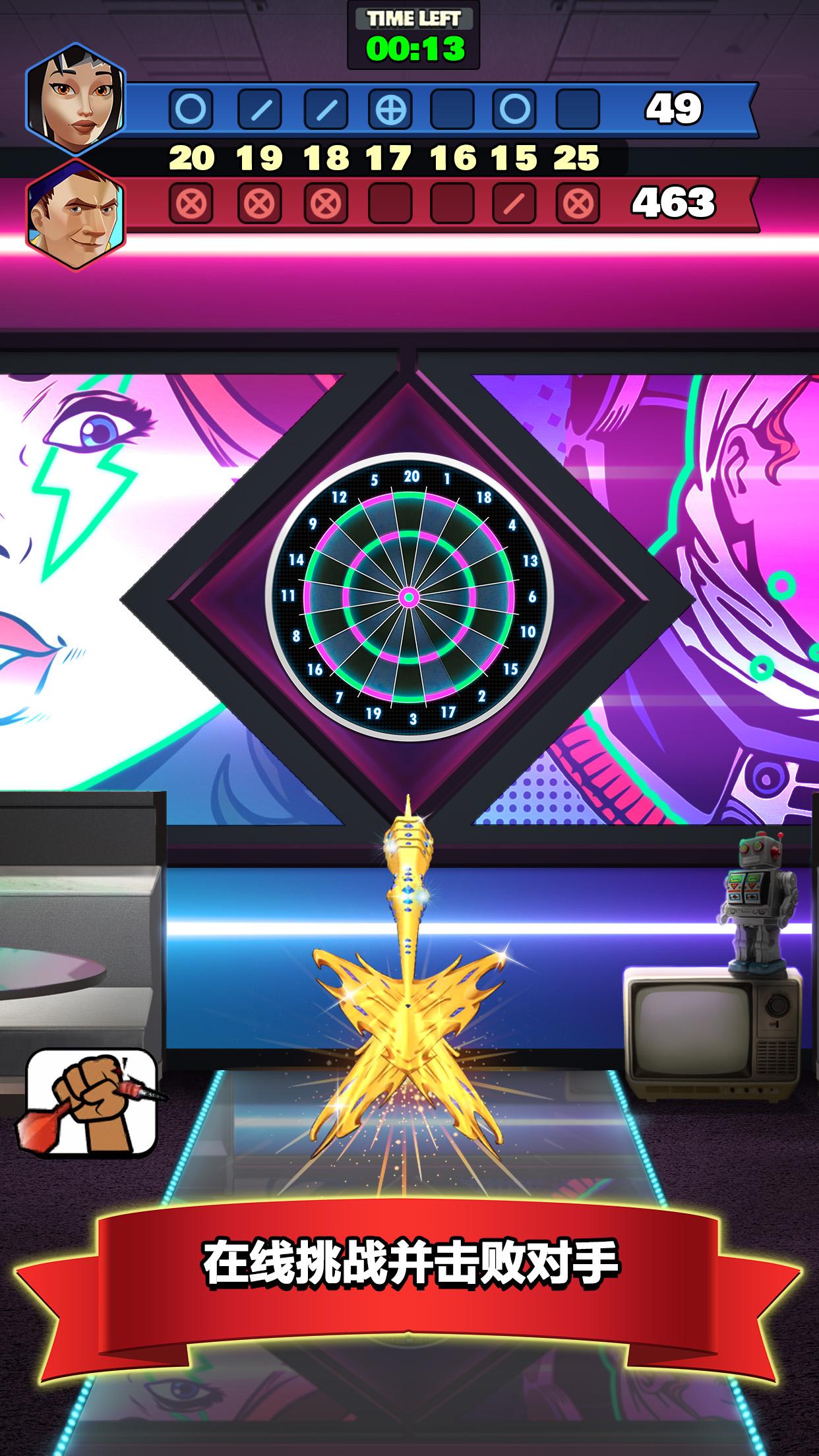 在这款特别参与的飞镖游戏中,与其他玩家在线竞技!学习高效并精准的投掷您的飞镖、掌握您的技能,并成为飞镖世界冠军!